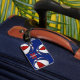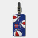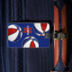 Den här märkrn för basketväskan är helt enkelt designad med tre slumpmässigt arrangerade basketbollar som har växlande röda, vita och blå paneler på anpassadets blå bakgrund - personliggör med spelare namn och monogram på framsidan, adress på baksidan - av katz_d_zynes