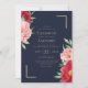 Den här bröllopsinbjudan har stor rosa och röda blommor i två hörn, med guld faux-folie i de andra två, på en mörk marin blå bakgrund Anpassa den med namnen av bruden och brudgummen och bröllop i texten om guld färgad. På baksidan upprepas blommigtens utformning och marin blå bakgrund.