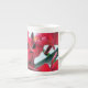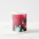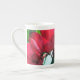 MaeFlowers originalfotografi på den här ljusa färgaden Bone China Mugg är en blomning av röda blommor med långa löv av grönt mot en lätt bakgrund av blå himmel. Nära fotots mittpunkt är en av blommorna förbi fullt-blomman, med torkning av bladen och kurvning vid kant, vilket visar blommans gult.