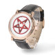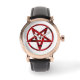 Rött, inverterat, texturerat pentagram i cirkel, på vit bakgrund. Ockult symbol. 666