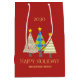 Få dina företagsgåvor att kännas extra speciella med denna personliga röda julklappspåse med tre färgglada moderna julgranar och anpassad text för ditt företagsnamn och år. En festlig och professionell touch för medarbetargåvor, klientpresenter eller företagsjulsfirande.
