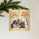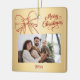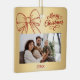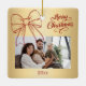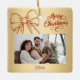 En faux guld tittar bakgrund, röd text och en röd handburen båge. Text och foto. God jul är skrivet med ett elegant handskrivet stil-teckensnitt.