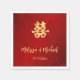 Kinesiska napkins har en konstnärlig lyckosymbol för guld dubbla på röd bakgrund. Bride och groom namn i ett handskript i modern elegant. .