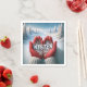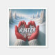 Snöflingor på röda handskar på vintern i skogen med WINTER-text.