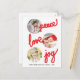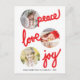 Anpassa detta stilrena, moderna, vertikala julkort med 3 bilder och med fet röd handskriven text: fred, kärlek, glädje på vit bakgrund. Bilderna är runda. Ersätt alla mallbilder med dina egna och ändra all information. För bästa resultat, använd högupplösta bilder. Det enklaste är om du använder fyrkantiga bilder. För andra format kan det finnas ett behov av att anpassa bilderna. Du gör det genom att klicka på "Anpassa"-knappen. Du kan då ändra storlek på och flytta runt bilderna. Fotografering © Storytree Studios, Stanford, CA
