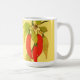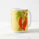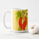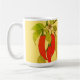 Röda heta chilipeppar på vinranka med gröna blad b kaffemugg