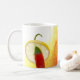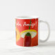 Fortfarande lever tre röda chilipaprika som bär sombrerors av citron och tangerin mot den texturerade bakgrunden till hett och solig mexikansk dag. Kaffe mugg. Lustigt vänskap tema. Du kan ändra malltexten Hola, Amigo!