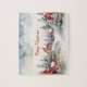 Rustiska rödtrimmade hus i landsbygdsområden ligger i närheten av snönära gräs träd. Allt är under vintriget himlar. Det här är en vintage, en vattenfärgsmålning. Om du vill kan du redigera det röda "God jul"-skriptet hälsning till annan text eller ta bort det. Det är en roligt helgdag-pussel!