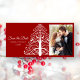 Ange en festlig ton för dina kommande decemberbesök med eleganten Red Julgran Winter Wedding Spara datumfotokortet. Anpassa den med namn, giftermål-ceremonin och bild. Du kan ändra text, teckensnitt eller bakgrund färg till kostym efter matrisbehov. I den här behållan för vinterceremoni och mottagning i anpassningsbar med giftermål har fotokortet en vit dekorativ utformning av julafton träd på röd bakgrund. Finns som en utskriven inbjudan att skicka eller som en digital nedladdning för att enkelt kunna dela digitalt online.