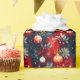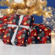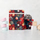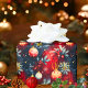 Ett festligt julmönster med röda och gyllene julgransprydnader, vinterbär, tallgrenar och ömtåliga snöflingor på en djupblå bakgrund. Rika, måleriska texturer och varma högtidstonaliteter skapar en elegant, tidlös look perfekt för att förpacka sofistikerade julklappar.