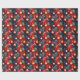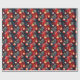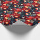 Röda julgransprydnader i guld på mönster i djupblå presentpapper