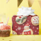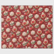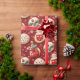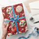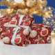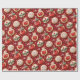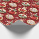 Festiv inslagning papper med en mönster av julkakor mot röd bakgrund.