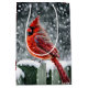 Röd kardinalfågel som gick på ett gammalt trästängsel med snö och snöflingor. Text kan redigeras.