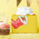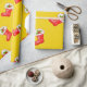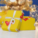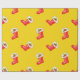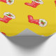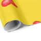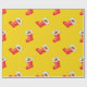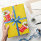 En färgfull papper julomslutning med en mönster av rött julhus utspridd över en gyllene gult.