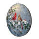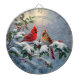 Ett par nordliga röda kardinaler på ett holly gren täckt med röda bär och snö.