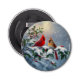 Ett par nordliga röda kardinaler på ett holly gren täckt med röda bär och snö.