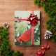 Ett par manliga och hona norrut kardinaler i ett holly träd, medan en tredje kardinal sitter på ett träträ av basket fyllt med nyplockat grovt löv och bär. Bilden skapades från en ursprunglig oljemålning av Crista Forest.