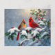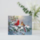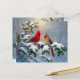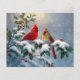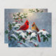 Ett par nordliga röda kardinaler sitter på en järneksgren täckt med röda bär och snö.