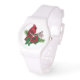 Handdragen röd kardinalfågel på en julbukett av fir grenar poinsettia och röda bär
