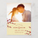 En asiatisk/japansk inspirerad, originalillustration av moderna och eleganta röda körsbärsblommor vårliljor med mörkbruna grenar på en ljus krämgul bakgrund över ett foto, save the date postkortsdesign.