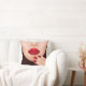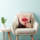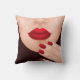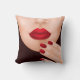 Kastkudde med en illustration av en kvinnas halva ansikte med röda läppar och röda naglar.