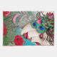 Kvinna med röda läppar och rosor abstrakt med påfågelsfjädrar