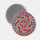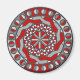 Denna koncentriska cirkelformning innehåller lagrar av geometriskt mönster som liknar redskap som man kan hitta i moderna eller till och med främmande maskiner, i röda nyanser och grått.