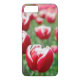 nära röda nederländska tulpaner med vit kanning i vår-trädgården