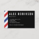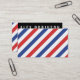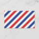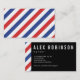 Ett mönstrat affärskort för en barber med rött och blått rand mot vit bakgrund. På ena sidan täcker designen hela kortområdet och på den andra sidan finns det ett smalt rand nedåt ett kant som lämnar gott om utrymme för ditt namn och detaljer i vit text på en svart bakgrund.
