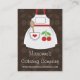 En gullig och retro stilvisitkort med ett röd och vitförkläde med en hjärta på dess fick-, en körsbärsröd appliquedesign och en träsked på ett dubbel körsbär och daisy tonar tonar på brun bakgrund för mörk. Dessa personliga visitkortar är perfekta för en bagare, en kock, en kock, ett bageri eller ett cateringföretag. Skräddarsy den till den spelar ingen roll något att säga dig önskar på baksidaen och beklär av kortet. Konstverk© Chrissy H. Studio, LLC. All reserverad rättigheter.