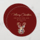 Elegant rött och guld God jul-kort med en guld-handskriven Julhälsningar och en vattenfärgad hjort på röd bakgrund med guld snö. Anpassa enkelt det här röda kortet och helgdag guld med din familj namn och ett meddelande. Guld-folieeffekten simuleras bara i teckningen.