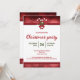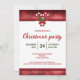 Kortet för julfestens inbjudan till julfesten som innehåller Desteis ursprungliga illustration av två röda och vita strimlade jular i candy cane som är dekorerade med en röd båge och en julklapp/gemensam hollfabrik. Toppen och grund har vackra röda kanten gräns, som även kan ses på andra sidan kortet. Anpassa exempeltextområdena med information om händelsen.