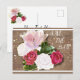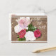 Planerar du ett bröllop? Vill du ha en inbjudan med shabby-chic-design? Det här är inbjudan för dig. Denna postkortsinbjudan har en tryckt bild av en målning av röda och vita rosor med en trägolv bakgrund.