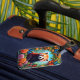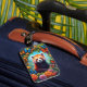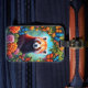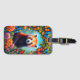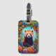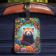 En röd panda sitter i en färglös trädgård, omgiven av vibrerande blommor och fladderande fjärilar.