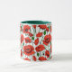 Mugg i ett känsligt mönster av pulserande röda vallmo med djupa gröntar och löv, på en och samma gång, med varje vallmoblomma unikt böjd och vriden, som om den sviktade försiktigt i bron.