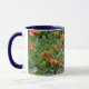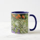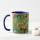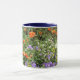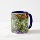 Vit mugg med mörk blått fälg och handtag, dekorerad med ett foto av en färgstark blomning.