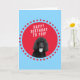 Ett sött foto av Pudel hund som önskar "Grattis på födelsedagen" med röda prickar i blå bakgrund och cirkel.
