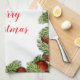 Denna säsongsbetonade kökshandduk har en festlig retrodesign med röda prydnader och inslag av julgrönska. Personifiera denna juldekoration handduk med din egen text eller köp som visat med God Jul i en script font. Denna jul kökshandduk är helt anpassningsbar så att du kan ändra den för dina julbehov.