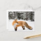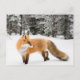 Röd räv med bushy svan i kallet, vit snö. Tall grönt gräs träd i bakgrunden. Vackert.