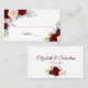 Dessa eleganta eskortkort är utformade för att du ska skriva in din gästs namn och bordnummer. De har en klassisk vit bakgrund med handmålade akvarellrosor och lövverk i nyanser av burgunder, rött och rosafärgat. Framsidan har ett utrymme för att skriva in gästens namn och bordnummer, och baksidan har namnen på det bröllopsparet i fin skrivstil tillsammans med bröllopsdatum.