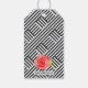 Derby-tema bröllopsdusch-gavor etiketter med röda rosor och blad på en bakgrund av rutmönstrade svarta och vita diagonala ränder. MATCHANDE artiklar i vår kollektion.