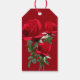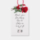 Röda rosor bröllopspresentkort med tackmeddelande och monograminitialer. Vita, band på kort, har röda rosenstjälkar på fram- och baksidan. Svart skrivstil används för tackmeddelandet med initialer tryckta under och åtskilda av en vertikal linje. Moderna och snygga för att knytas till presenter och små gåvor till showerdeltagare och/eller bröllopsgäster. Baksidan är röd med fler rosor.