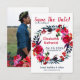 Mall för foto från den eleganterna personligen, bröllop spara datum, med en vattenfärgad andedräkt med ro, blommor, fjädrar och blad och ett kalligrafiskt skript för chic. Fyll i informationen på plats. Du kan välja att anpassa den ytterligare genom att ändra typsnitt och färg på text. — Inbjudan är lämplig för trendig boho land vår sommar/natur bröllop. — Kontakta mig om du behöver hjälp med designen!