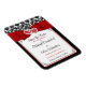 Om du har hittat kärleken i ditt liv och vill inbjuda alla dina familjemedlemmar och vänner att bevittna föreningen av era två liv och hjärtan, då är denna underbara magnet för "save the date" i svart och vitt damask med sammanfogade hjärtan över ett rött band och en bild av en båge som löper överst, ett bra sätt att tillkännage er kommande vigsel. Den har ett svart och vitt damaskbakgrundsmönster ovanför bandet med vigselinformationen tryckt under bandet på en vit bakgrund i svart och röd text med fyra svarta hörnsnörkler som matchar vigselinbjudan. Om du behöver hjälp eller vill ha en större magnet för "save the date" istället, vänligen maila din förfrågan till niteowlstudio@gmail.com eller använd Zazzles chattfunktion för att