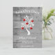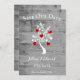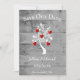 Anpassa ett unikt bröllop-meddelande med en röd Träd av Hearts Spara datumet. Meddelandedesign har en bakgrund av grått-trä som lagts till med ett träd med blommande hjärtan på grenar och text som du kan anpassa med din information om datum för bröllop. Ytterligare spara datum meddelande som är tillgängligt för den här konstruktionen i en mängd olika färg.