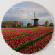 Knäppas med en vår landskap med ett fält med röda tulpan, och annat blommar, och en kvarn under soluppgång i Keukenhofen arbeta i trädgården, kularegionen, Nederländerna.