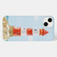 Röd och vit fyr torn står högt över det blå havet och står mot blå himmel med flytande vita moln.