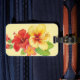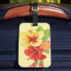 Aloha, en röd och gult hibiscus bagagemärke med en affärskort på baksidan.