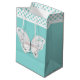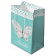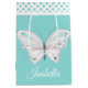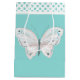 Elegant anpassad presentpåse i medelstorlek i rödhakens blåa färg, med grafik av en snygg vit fjäril på fram- och baksidan, och prickigt band runt toppen. Anpassa den vita texten på framsidan av påsen till vad du önskar. Fin presentpåse och matchande vävnadspapper finns tillgängligt.