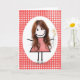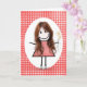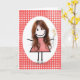 Rödhårig födelsedagsstickfigur tjej på gingham kort